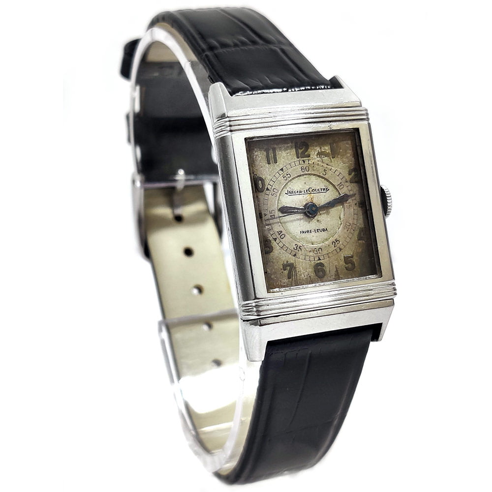 Vintage Jaeger-LeCoultre Reverso Favre-Leuba 1950 Manual Winding Swiss Wristwatch. Original Dial. Stainless Steel unpolished Case 23mm in diameter and 38mm form lug to lug. The reverse side features a solid case-back. Aftermarket Strap/Buckle Attached. The watch is in perfect condition and Accurate time keeping. All parts is original, 100% Authenticity guarantee.